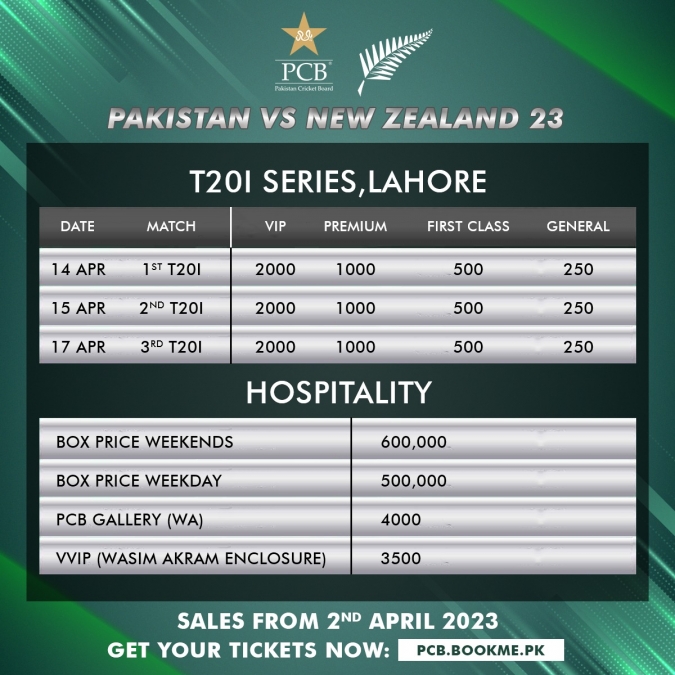 The tickets for the three T20 Internationals between Pakistan and New Zealand in Lahore will go on sale on Sunday (2 April) at 11am. The two teams play on 14, 15 and 17 April at the Gaddafi Stadium.